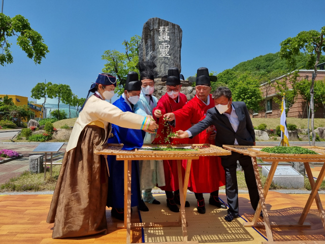 이날 행사는 상주 함창향교의 집전으로 김종수 경북도 농축산유통국장의 강신(신을 맞이하는 예절)과 초헌례(첫 번째 잔을 올리는 의식), 최현식 함창향교 전교의 아헌례(두 번째 잔), 박태규 상주양잠협동조합장의 종헌례(세 번째 잔), 누에 첫 밥 주기 시연회 순으로 진행됐다.