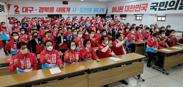 국민의힘은 이날 오후 4시 대구시당 강당에서 공천장 수여 및 대구 선대위 발대식을 열었다. 이날 행사에는 상임선대위원장을 맡은 주호영 의원(대구 수성구갑)과 선대본부장 김용판 의원(대구 달서구병), 부위원장 강대식 의원(대구 동구을), 홍준표 대구시장 후보를 비롯한 출마자 대부분이 참석했다.