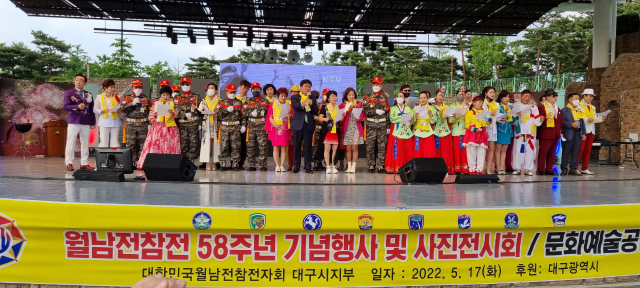 국가유공자 보훈단체인 대한민국 월남전참전자회 대구시지부(지부장 안형준)는 17일 대구두류공원 코오롱야외음악당에서 참전용사, 내빈 등 1천여 명이 참석한 가운데 월남전참전 58주년 기념 행사와 호국사진전시회를 가졌다. 이날 재능기부를 위한 월남전참전자회 대구문화예술공연단(단장 차대근)도 창단했다.