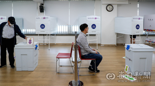 제8회 전국동시지방선거 사전투표 첫날인 27일 오전 대구 달서구 죽전동행정복지센터 투표소에서 유권자가 투표를 하고 있다. 오전 11시 기준 대구 투표율은 2.46%로 전국 최저를 기록 중이다. 우태욱 기자 woo@imaeil.com