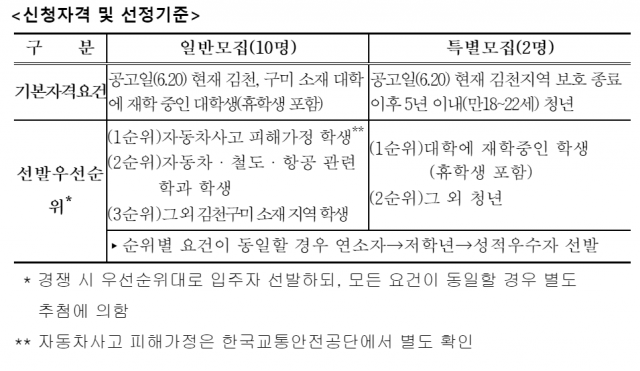 공유사택 입주 모집 대상은 김천·구미 소재 대학에 재학중인 대학생(휴학 포함) 또는 김천지역 아동복지시설 등 보호 종료 이후 5년 이내(만 18세~22세) 청년이다.