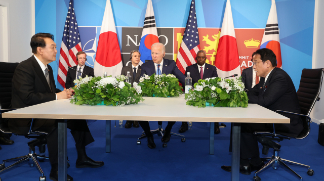 윤석열 대통령은 이날 오후 나토 정상회담장에서 조 바이든 미 대통령, 후미오 기시다 일본 총리와 '3개국 정상회담'을 진행했다.
