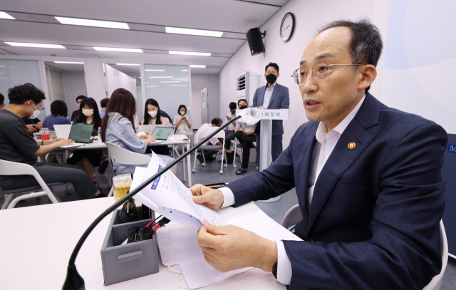 이와 함께 추 부총리는 코로나19 확산과 폭우 피해, 경기 침체 우려 등에 대응해 추가경정예산(추경)을 편성할지 여부에 대해서는 "본예산 하기에도 여념이 없다"며 "추경할 상황도 아니고 본예산을 잘 만드는 데 최선을 다하고 있다"고 답했다.