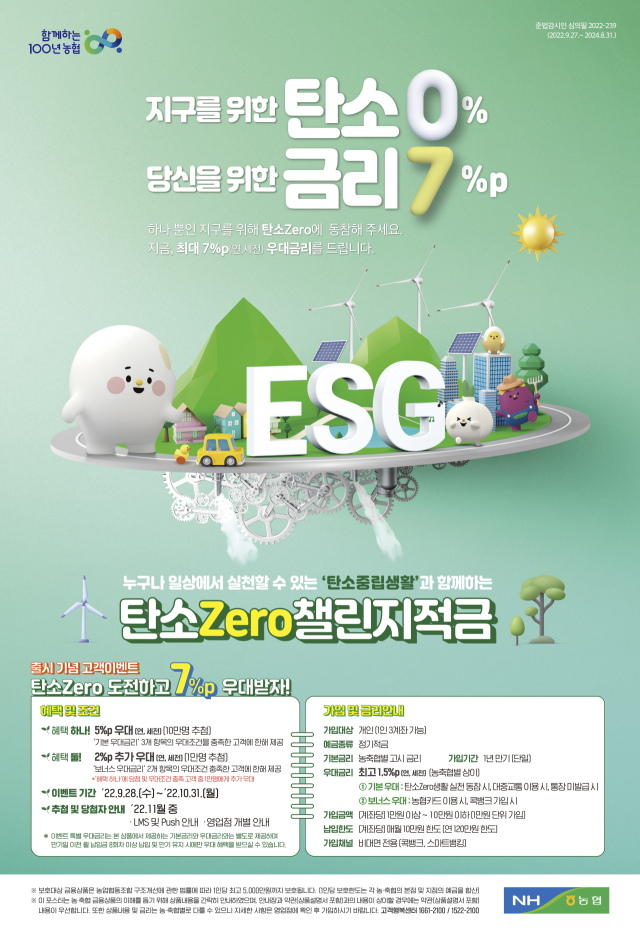 농협 상호금융이 판매하는 '탄소Zero챌린지적금'도 눈에 띄는 상품. 일상생활 중 ESG(친환경, 사회적 책임 이행, 지배구조 개선) 실천을 장려하기 위해 탄소중립 생활수칙 준수, 대중교통 이용 등 탄소중립 실천 고객에게 우대금리를 제공하는 비대면 전용 상품이다.