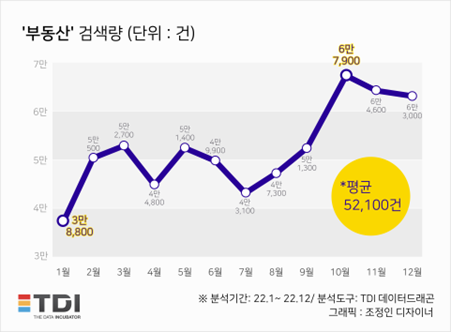 TDI(티디아이)가 데이터드래곤을 통해 분석한 결과 2022년 한 해 '부동산' 검색량은 일 평균 5만 2천100건이라고 밝혔다.