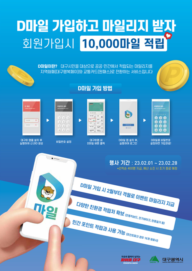 30일 대구시에 따르면 그간 D마일은 가입 즉시 소량이나마 포인트를 지급하는 일부 민간 서비스와 달리 기본 제공 마일리지가 없었다. 그런데 이번에 처음으로 현금 1만원처럼 사용할 수 있는 마일리지를 선착순 지급한다. 게다가 올해는 플랫폼 이용자 확대를 목표로 짝수 달마다 신규 가입자에게 마일리지를 지급하는 이벤트를 할 계획이다.