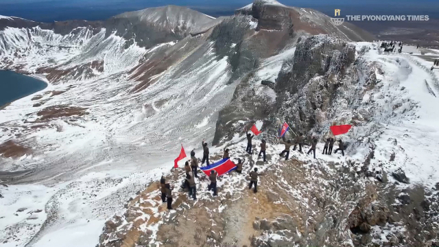 특히 인공기를 든 백두산 답사 행렬도 담겼는데, 이는 김정은 북한 국무위원장의 지난 2019년 '백두산 군마 등정' 이후 각계각층의 백두산 혁명전적지 답사가 독려됐고, 그 중 한 모습으로 풀이된다.