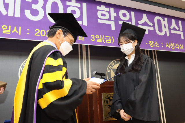 구미대학교는 3일 시청각실에서 제30회 학위수여식을 했다. 학위수여식은 코로나19 확산 예방을 위해 주요 내빈, 졸업생 대표 등 50여 명이 참석하는 약식으로 진행됐다.