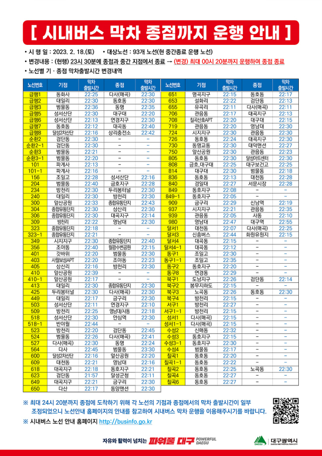 시내버스 막차 시간에 대한 세부적인 안내는 시내버스 노선안내 홈페이지를 통해서 확인할 수 있다. 배춘식 대구시 교통국장은 "앞으로도 시민들이 시내버스를 더욱 편리하게 이용할 수 있도록 대중교통 수송분담률을 높이고 재정지원금도 절감하겠다"고 말했다.