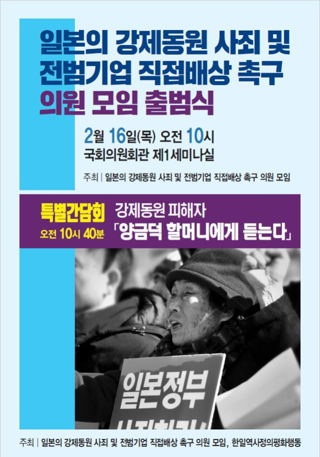 15일 윤미향 무소속 국회의원실은 내일인 16일 오전 10시에 국회의원회관 제1세미나 '일본의 강제동원 사죄 및 전범기업 직접배상 촉구 의원 모임' 출범식을 갖는다고 밝혔다.