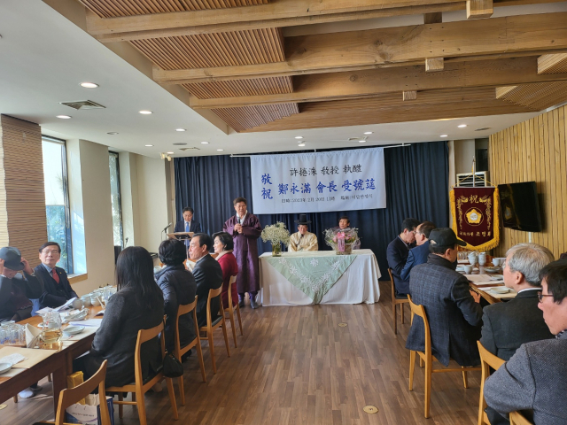 정영만 제이아그로 회장(매탑 4기)이 경남 유림의 큰 어른으로 불리는 동택(東澤) 허권수(許捲洙) 선생으로부터 호(윤천 潤泉)를 받는 '수호연(受號筵)'이 20일 낮 대구 달서구 한 음식점에서 열렸다. 이날 행사에는 영남지역 각 문중의 종손과 화수회장들을 비롯해 국민의힘 조명희 의원과 이상흔 대구보훈병원장 등 하객 50여명이 참석했다.