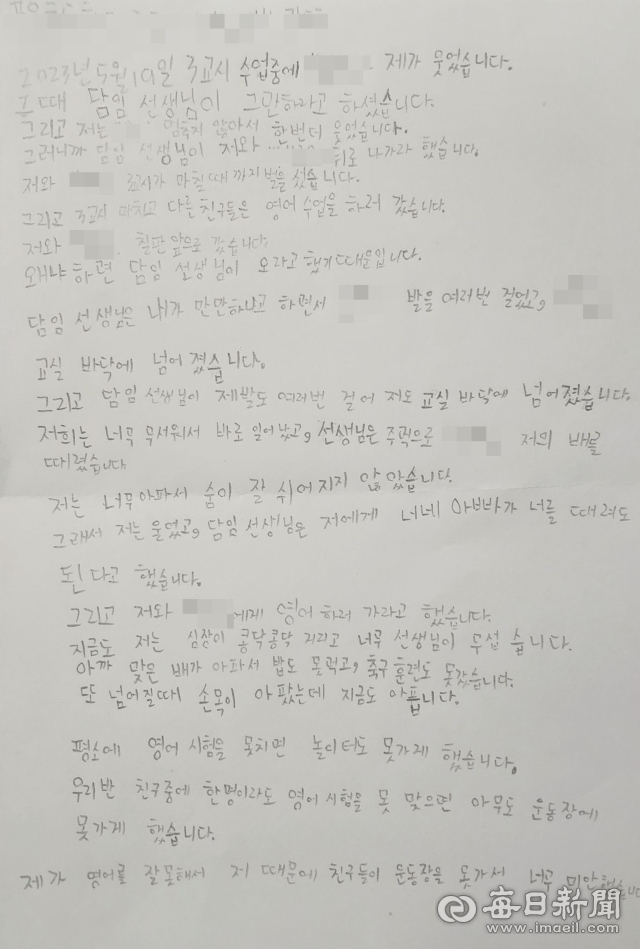 한 피해 학생은 당시 상황을 적은 글에서 "(배가)너무 아파서 숨이 잘 쉬어지지 않았다. 저는 울었고 선생님은 '너네 아버지가 때려도 된다'고 했다"면서 "지금도 심장이 콩닥거리고 선생님이 너무 무섭다. 맞은 배가 아파서 밥도 못먹는다"고 후유증을 호소했다.
