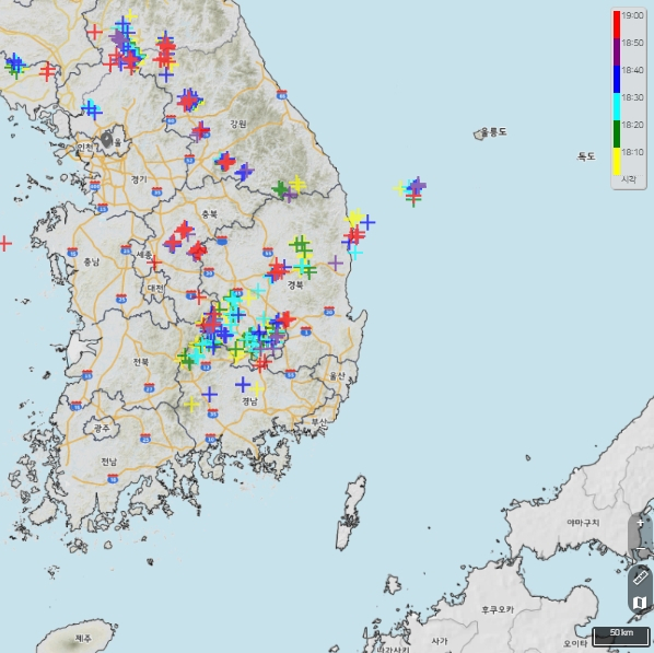 좀 더 넓게 보면 낙뢰도 소나기 등 비가 집중되고 있는 영남 지역에 역시 몰려 발생하고 있는 상황이다. 이밖에 충북 내륙과 강원 영서 지역 등에도 낙뢰가 이어지고 있다.