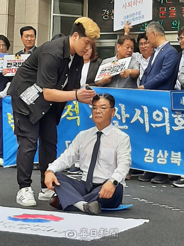 이날 양재영 경산시의원은 박 의장의 사퇴를 요구하며 삭발을 했다.