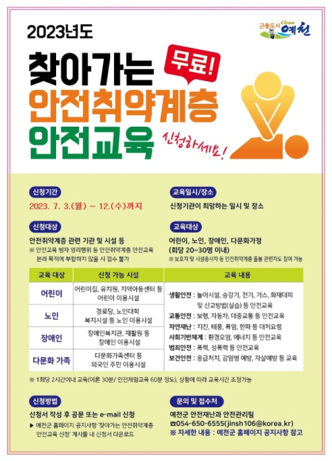 경북 예천군은 오는 14일까지 '찾아가는 안전취약계층 안전교육' 신청자를 모집한다.