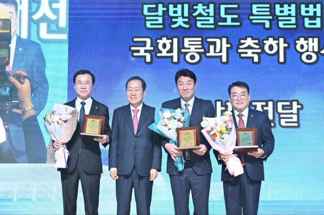 강대식 국민의힘 의원(대구 동구을)이 7일 광주시 김대중컨벤션센터에서 개최된 '달빛철도 특별법 국회 통과 축하 행사'에서 홍준표 대구시장으로부터 법안 제정에 기여한 공로로 감사패를 받았다.