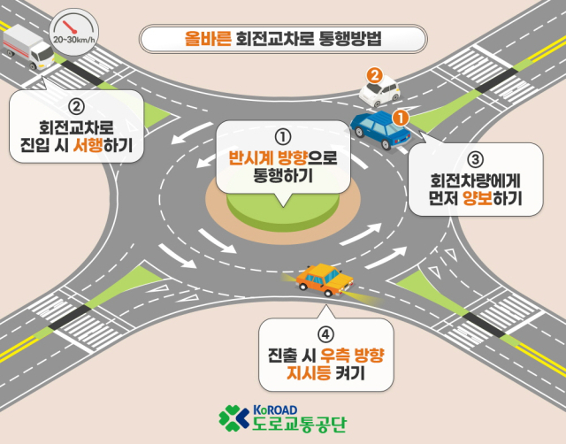 공단에 따르면 회전교차로는 반드시 반시계 방향으로 통행하고, 회전교차로 진입 전에 서행, 먼저 회전 중인 다른 차가 있다면 일시정지하고 양보 후 진입해야 한다. 손이나 방향지시등으로 신호를 하는 차가 있는 경우 그 뒤차의 운전자는 신호를 한 차의 진행을 방해하면 안 된다.