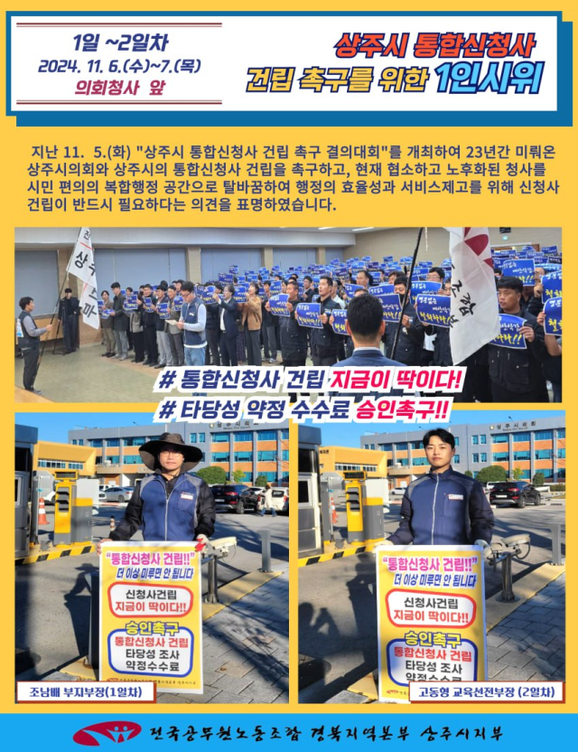 전국공무원노조 상주시지부와 전국자치단체공무직본부 상주시지부 등 일부 단체는 이달 들어 상주시 신청사 건립을 촉구하는 결의대회를 잇따라 열고 있다. 지난 6일부터는 의회청사 앞 사거리와 서문사거리에서 1인 시위도 이어가고 있다.