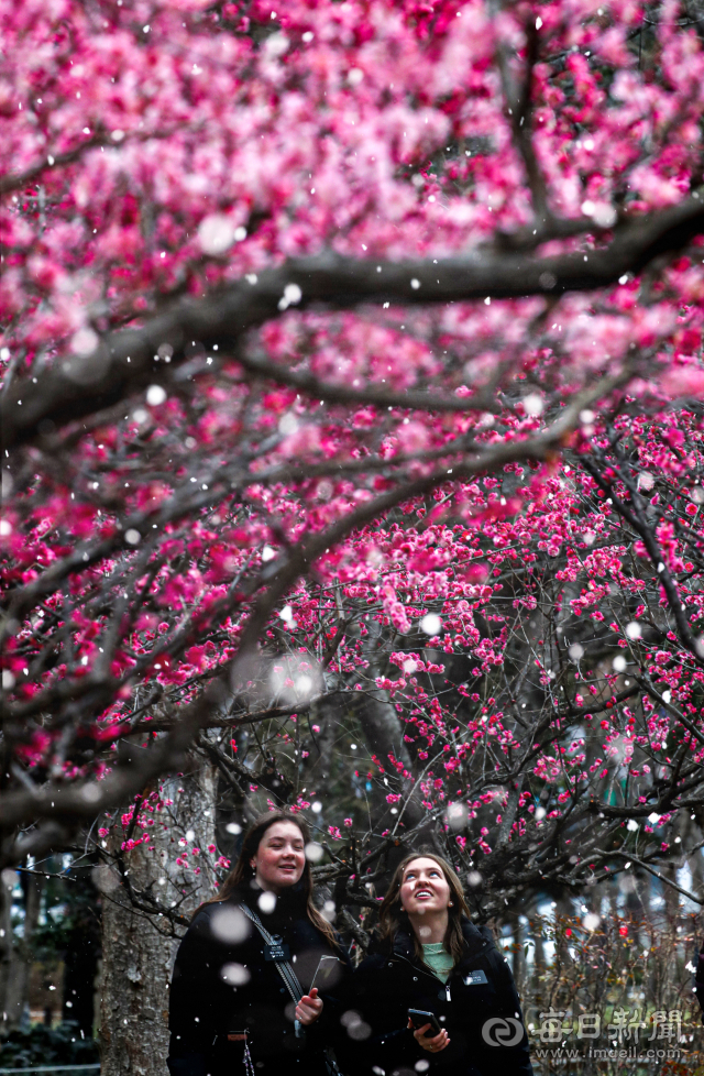 춘분을 이틀 앞두고 전국 대부분 지역에 눈이 내린 18일 대구 중구 국채보상운동기념공원을 찾은 외국인들이 홍매화 나무 아래서 눈을 맞고 있다. 안성완 기자 asw0727@imaeil.com