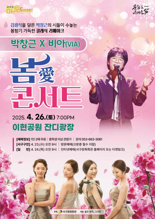 아름다운 꽃과 바람이 어우러지는 야외무대에서 펼쳐지는 이번 공연은 서구문화회관 대표 기획 프로그램 '서구愛 마토콘서트'의 일환으로 마련됐다.