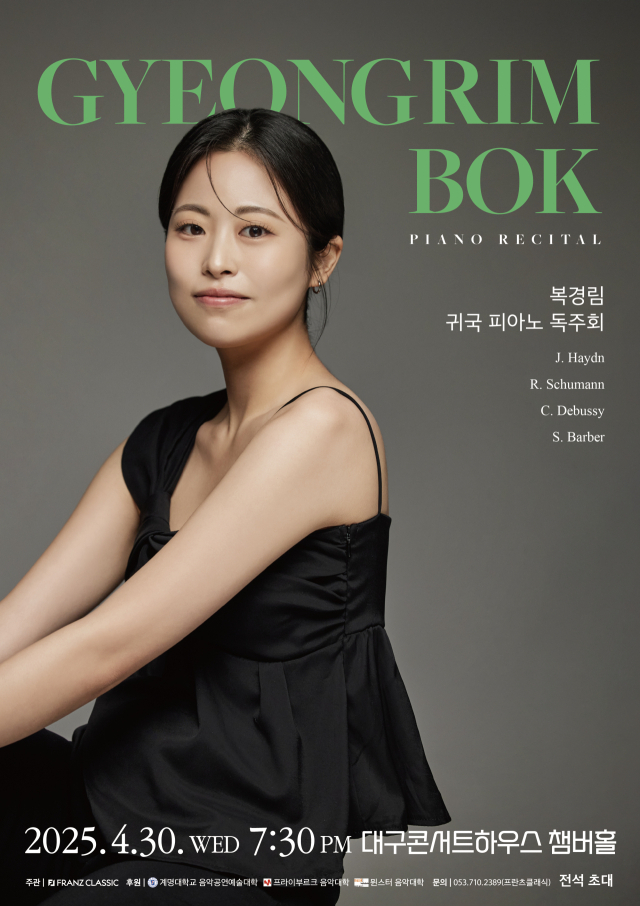 피아니스트 복경림의 귀국 피아노 독주회가 오는 4월 30일(수) 오후 7시 30분 대구콘서트하우스 챔버홀에서 진행된다.