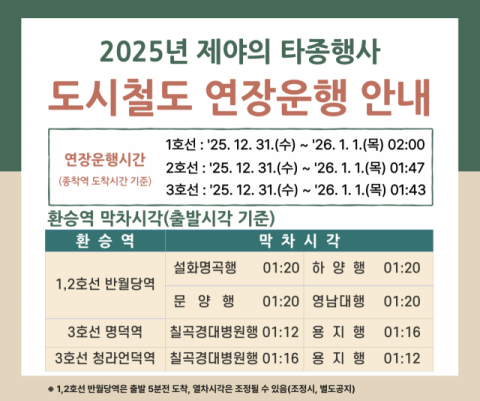 병오년(丙午年) 새해를 맞아 '제야의 타종' 행사가 오는 31일 오후 10시부터 국채보상운동기념공원 달구벌대종 앞 특설무대에서 열린다.이번 행사에서는 2026년 새롭게 변화하고 도약할 대구의 내일에 대한 희망을 담은 '2026 대구, 새로운 울림'이라는 슬로건 아래 다채로운 문화 행사가 진행된다. 타종식에는 주요 기관·단체장들과 올해를 빛낸 자랑스러운 시민들이 타종인사로 참여한다.타종 후 김정기 대구시장 권한대행의 신년사와 시민들과 함께하는 '대구찬가' 합창, 불꽃쇼가 펼쳐진다.문화 행사로는 올해 동성로에서 열린 '청년버스킹 경연대회' 수상팀의 활기찬 공연을 시작으로 남녀노소가 모두 즐길 수 있는 트로트, 성악, 퓨전국악 등 다양한 장르의 공연이 이어진다.특히 올해는 달구벌대종 좌우에 가로 10m, 높이 5m의 대형 화면을 설치해 시각적 연출을 다양화하고, 시민들에게 현장의 모습을 보다 더 생생하게 전달할 예정이다.현장에 모인 시민들에게 새해를 기념하는 야광 머리띠를 배부하고 ▷적토마 포토존 ▷캘리그라피 연하장 만들기 ▷굿바이 2025 포토 네컷 ▷신년 타로 운세 등 다양한 체험 프로그램을 운영한다. 또한 참여한 시민들에게 핫팩과 따뜻한 음료도 제공한다.대구시는 이번 행사에 많은 인파가 모일 것으로 예상됨에 따라 교통통제 및 안전관리를 위해 경찰·공무원 등 760여 명의 인력을 배치하고, 안전펜스 설치 및 현장구급반 운영 등으로 안전사고를 예방한다는 계획이다.한편 행사 당일 오후 10시 30분부터 다음날 오전 1시 30분까지 동인네거리~삼덕네거리, 공평네거리~동신교 서편 구간이 전면 통제된다.행사장 인근을 통과하는 시내버스 18개 노선은 오후 10시 30분 이후 행사장을 우회 운행하고, 직행 1개 노선과 급행 4개 노선은 오전 1시부터 시내를 통과한다. 도시철도는 반월당역과 명덕역, 청라언덕역에서 막차 운행시간을 다음날 오전 1시 10~20분으로 연장한다.