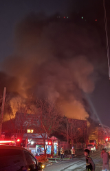 26일 오후 8시 43분쯤 대구 동구 방촌동의 한 조명 자재 공장에서 화재가 발생해 신고를 받고 출동한 소방대원들이 진화작업을 벌이고 있다. 불이 인접 건물로 번지자 소방 당국은 오후 9시 6분 대응 1단계를 발...