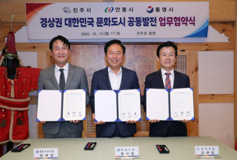 안동시는 13일 진주시 진주성 내 중영에서 진주시, 통영군과 함께 '경상권 대한민국 문화도시 공동발전을 위한 업무협약'을 체결했다. 이번 협약은 경상권 대표 문화도시인 안동·진주·통영이 상호 협력체계를 구...