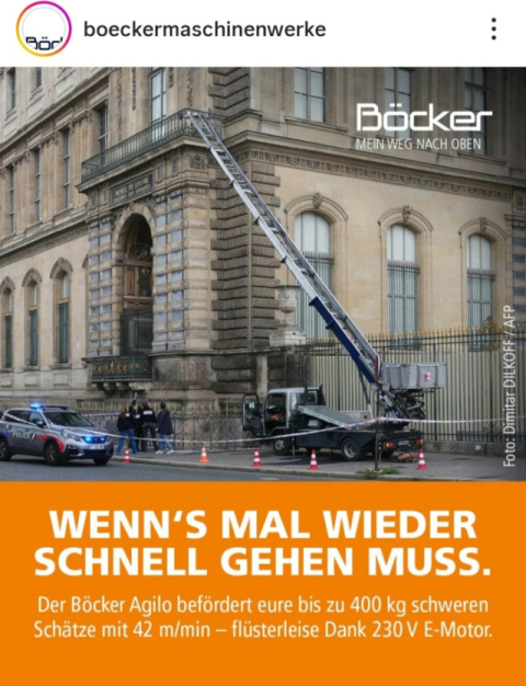 프랑스 루브르 박물관 절도 사건 이후 범행 현장이 새로운 관광 명소로 떠오르는 가운데 범죄에 이용된 사다리차 제조업체가 이번 사건을 활용한 새 광고 포스터를 선보였다. 24일(현지시간) 영국 BBC 방송에 따...