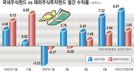 해외주식직접투자펀드 수탁고는 국내순수주식형 펀드 수탁고가 감소하기 시작한 지난해 말부터 증가폭이 커지면서 올 들어서만 7조 원 이상 늘어난 것으로 추정된다. 결국 국내펀드에서 환매된 자금이 해외주식펀드로 이동되고 있다는 분석.