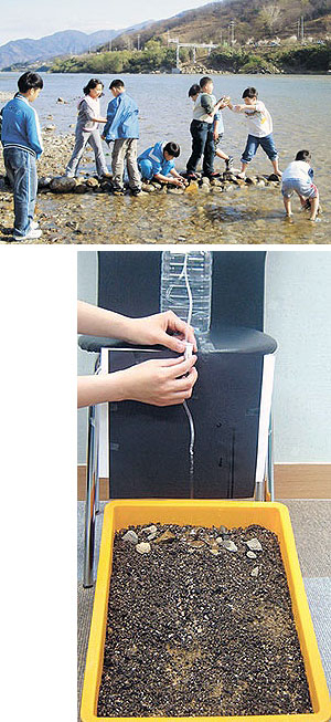 ▷계곡 만들기-물의 순환을 보면 하늘에서 떨어진 비는 계곡을 타고 강으로 흘러 바다로 모인다. 이러한 과정을 간단한 실험으로 이해할 수 있다. 가로 50cm, 세로 1m, 높이 20cm가 되는 나무 상자 혹은 골판지 상자에 모래를 비스듬히 담아놓고 상자 아래는 바다를 상징하는 얕은 웅덩이를 파놓는다. 상자 맨 위쪽에서 양동이를 이용해 물을 부으면 어떤 현상이 일어날까? 물이 떨어진 곳에서부터 상류에 해당하는 좁은 계곡과 폭이 넓어진 중류, 모래가 쓸려 내려간 뒤에 생긴 퇴적층을 형성하고 있는 하류, 그리고 물이 흘러 바다에 고이는 일련의 과정들을 이 활동으로 한눈에 알 수 있다.
