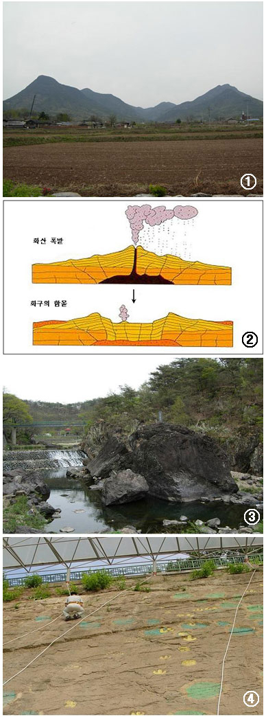 이곳은 과거 중생대 백악기(약 7천만 년 전) 화산 폭발에 의해 형성되어 화산분화구가 꺼져 내려앉은 칼데라(화산 함몰체)로 오랜 세월의 풍화와 침식을 받아 화산의 밑둥치만 타원형으로 남아 있다. 서쪽으로 금성산이, 동쪽으로 비봉산(672m)이 위치하며 중앙으로 기울어진 현무암 암층의 모습이 산 중턱으로 보인다.