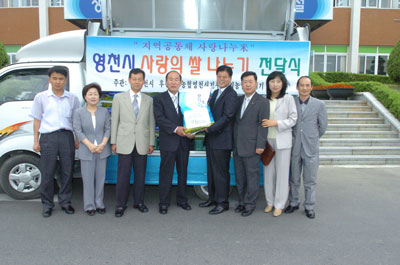 농협 영천시지부(지부장 김창남)와 우리농업지키기운동본부는 28일 영천시청 마당에서 '지역공동체 사랑나누미 사랑의 쌀 나누기 행사'를 열고, 사회복지시설과 무료급식지원센터, 지역의 어려운 이웃들을 위해 써달라며 손이목 영천시장에게 쌀 100포(430만 원 상당)를 전달했다.