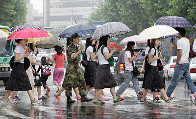 남쪽에 머물던 장마전선이 북상하면서 4일 오전 대구·경북 전역에 장맛비가 내리자 대구시 남구 대명동에서 학생들이 우산을 받쳐들고 등교하고 있다. 이번 비는 오늘 오후 늦게 갠 뒤 금요일쯤에 다시 차차 흐려지면서 비가 내리겠다고 대구기상대는 예보했다.