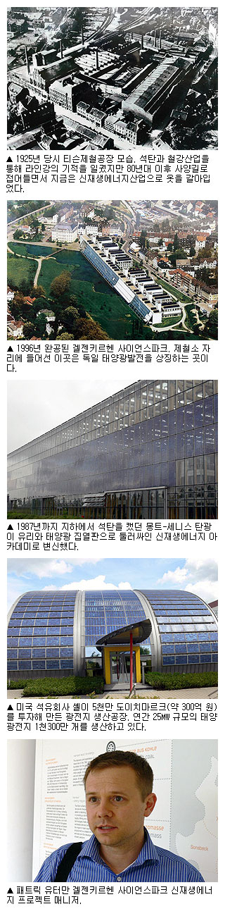 지난달 19일 찾은 독일 노르트라인베스트팔렌(NRW)주의 작은 도시 겔젠키르헨 도심에 위치한 사이언스파크. 1996년 태양광 집열판 900개, 연간 14만㎾h의 전기를 생산하는 등 당시 세계 최대 태양광발전시설이 이 건물 지붕에 놓이면서 독일 신재생에너지의 출발점이 된 이곳은 원래 1920년 초 지어진 티슨제철공장 자리였다.