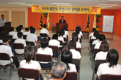한국서부발전(주) 청송양수건설처(처장 이한희)는 12일 파천면 신흥리 청송양수건설처 2층 강당에서 '제8회 장학금 전달식'을 갖고 초등학생 23명(460만 원), 중학생 73명(2천190만 원), 고교생 75명(4천500만 원), 대학생 3명(300만 원) 등 총 174명에게 7천450만 원의 장학금을 전달했다.