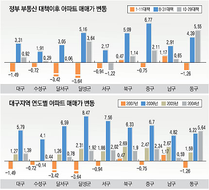 부동산 114 조사에 따르면 '1·11' 부동산 대책 이후 대구 지역 아파트 매매가 변동률은 지난 6개월간 -1.49%를 기록, 지난 2005년 '8·31 조치' 및 2003년 '10·29 대책' 발표 이후 6개월간 변동률인 3.31% 및 0.92%와 큰 차이를 보였다.