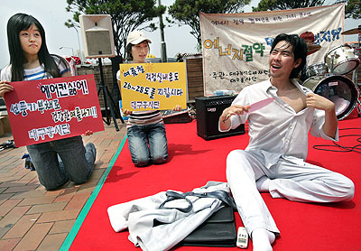 여름철 냉방기 사용으로 에너지 소비가 급격히 늘어나자 대구녹색소비자연대와 대구흥사단은 12일 지하철 동대구역 입구에서 에너지 절약 캠페인에 나서 넥타이를 풀고 부채사용을 권장하는 퍼포먼스를 펼치고 있다.