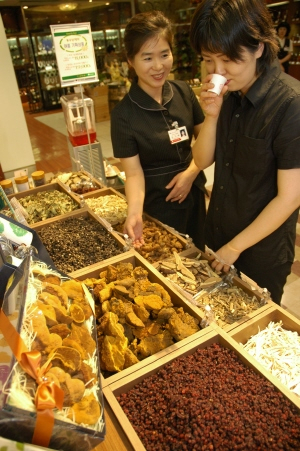 여름철을 맞아 더위에 지친 사람들의 기운을 북돋워 주는 것으로 알려진 천연 차들이 인기다. 대백프라자 식품 코너에는 길경(약도라지)을 비롯해 오미자·황기·오가피·영지·삼백초·둥굴레·구기자 등 건강 차 원료들이 총집합했다. 판매가는 100g에 5천 원부터.