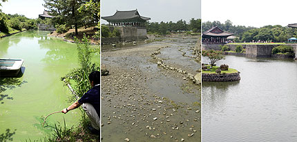 경주시는 안압지에 대해 지난달 7일 물빼기 작업을 시작해 2주 동안 2만 8천t을 배수하고 바닥의 각종 쓰레기 등 8t의 퇴적물을 수거한 뒤 10일 정도 바닥을 건조시키고 다시 물을 채웠다고 6일 밝혔다.