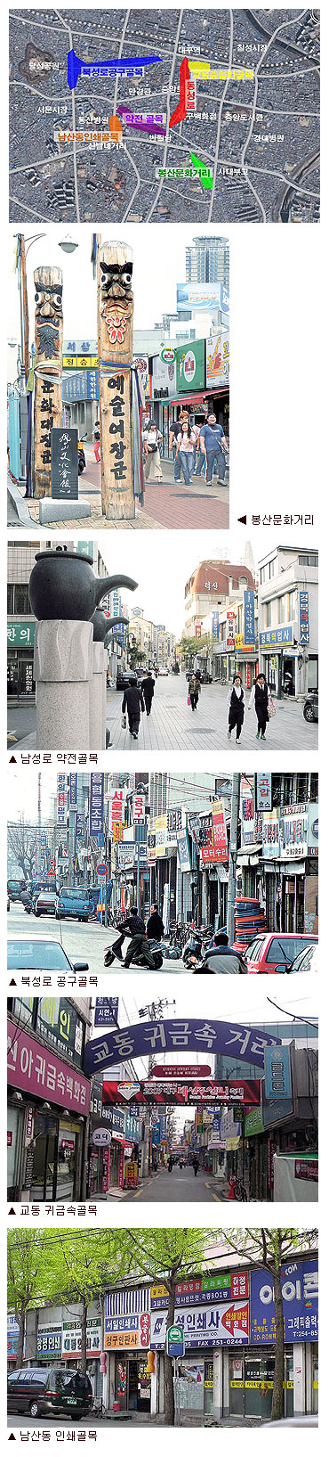 ▶인쇄골목=1980년대 이후 중구 남산동 일대에 하나둘씩 생기기 시작한 인쇄관련 업소들이 1990년대 들어 600여 업체에 달하게 되었다. 인쇄업은 입지 특성상 소비자와 가까운 곳에 시장지향형으로 입지하기 때문에 신문사, 대기업, 관공서 등이 밀집한 도심에 위치한다. 2000년부터 공동발전을 모색하고 타지역과의 경쟁에서도 이길 수 있도록 하기 위해 남산인쇄골목 축제를 개최하고 있다. 현재 317개의 인쇄업체가 모여 있다.