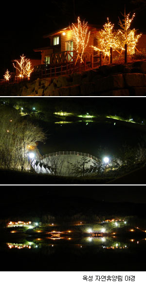 특히 휴양림 앞 저수지 주변 수변데크에도 잔디등과 경관조명등으로 저수지 수면위로 멋진 야경을 연출해 낮보다 밤이 더 멋진 자연휴양림으로 조성하고 있다.