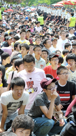 하지만 이들이 떠난 자리에는 쓰레기만 가득했다. 자원봉사를 맡은 영남이공대 학생들은 쓰레기봉투를 들고 대운동장 입구부터 교정 후문까지 이어진 쓰레기더미를 치웠다. 강용신(21·영남이공대 2년)씨는 "질서유지인 줄 알고 자원봉사에 참여했는데 이럴 줄 몰랐다"며 쓰레기더미를 넋놓고 바라보았다.