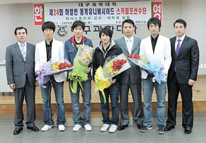 대구과학대학(총장 김석종)은 24일 대학본부 제2세미나실에서 최근 중국 야부리 스키장에서 치러진 제24회 동계 유니버시아드대회 스키점프에서 개인전과 단체전을 석권한 레저스포츠과 1학년 김현기선수와 최흥철·최용직·강칠구 선수에 대한 환영식을 갖고 공로상을 수여했다.(사진 왼쪽부터 김석종 총장, 강칠구·김현기·최용직·최흥철 선수)