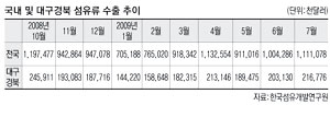 대구경북지역의 섬유류 수출액은 미국발 금융위기 이전인 지난해 10월 2억4천591만1천달러를 정점으로 줄기 시작해 올해 1월에는 1억4천422만달러를 기록했다. 우리나라 전체 수출액은 올들어 7월말까지 65억4천700만5천달러로 지난해 같은 기간에 비해 18.8% 감소했다.