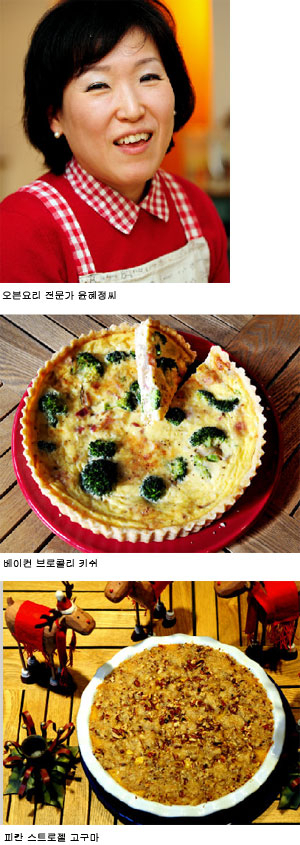 베이컨 브로콜리 키쉬는 파이틀을 구운 후 내용물을 넣어 다시 굽는 요리다. 내용물(필링)은 원하는 야채, 고기 등을 마음대로 넣어도 되고, 치즈 역시 원하는 종류를 넣으면 돼 응용 범위가 넓다. 피칸 스트로젤 고구마는 달콤하고 부드러운 후식 음식으로, 메인뿐만 아니라 디저트로 활용이 가능하다.