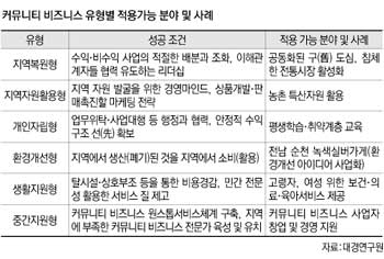 박 연구원은 "선진국은 이미 지역사회 활성화를 위한 방법으로 커뮤니티 비즈니스를 적극 활용하고 있다"고 했다. 그는 "선진국은 지역의 유휴자원을 발굴하고 사업화해 고용을 창출하고, 기업가 정신 확산을 통한 지역 활성화를 목적으로 커뮤니티 비즈니스를 육성하고 있다"며 "지속적인 운영지원과 리더십 지원체계가 성공의 원동력으로 작용하고 있다"고 말했다.