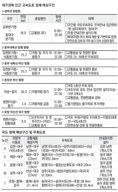 이에 따라 국토부는 내달 1~6일을 '설 연휴 특별교통대책 기간'으로 정하고 전국 도로의 정체 구간을 지정했다. 대구경북의 경우 경부·중부내륙·88고속도로와 지방도로 일부 구간을 교통량 증가 및 병목 구간으로 지정하고 대책안을 마련했다.