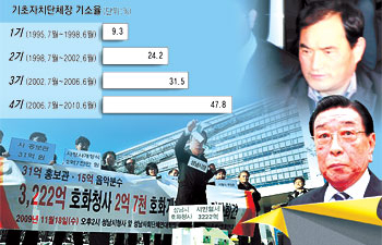 지방자치 시행 20년이 됐지만 기초단체장들에 대한 기소 비율은 점점 높아지고 있다. 기소 비율을 보면 1기 9.3%에서 2기 24.2%, 3기 31.5%, 4기 47.8%다. 2006년 하반기부터 임기가 시작된 민선 4기의 경우 기초단체장 230명 중 절반에 육박하는 110명이 비리 등의 혐의로 기소됐다. 전북 임실군의 경우 1995년 이후 선출된 군수 3명 모두가 뇌물수수 등 비리혐의로 구속돼 임기를 마치지 못하고 중도 퇴진했다. 이에 따른 행정공백과 지자체의 파행운영으로 인한 피해는 고스란히 주민의 몫으로 돌아간다.