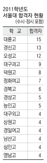 대구시교육청에 따르면 1일 서울대가 발표한 2011학년도 정시모집 합격자를 파악한 결과 모두 83명이 합격해 수시 91명 포함, 174명의 합격자를 배출한 것으로 나타났다. 지난해에 비해 정시에서는 4명이 더 합격했지만 수시에서 7명이 줄면서 전체 합격자는 3명 줄었다. 대구의 서울대 합격자 수는 2007학년도 231명, 2008학년도 186명, 2009학년도 150명으로 줄어들다 지난해 177명을 기록했다.